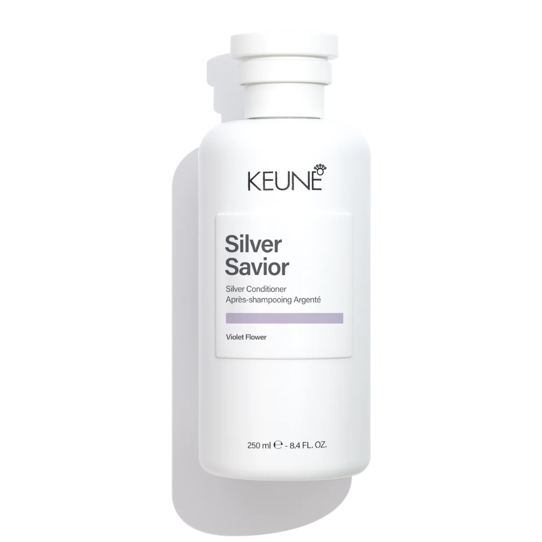 Keune Care Silver Savior Conditioner — тонуючий кондиціонер для підтримки холодних, попелястих відтінків волосся (блонд, серебряний, платиновий). Його багата кремова формула з фіолетовими пігментами нейтралізує небажану жовтизну, зволожує та згладжує волосся, залишаючи його шовковистим, м’яким і блискучим.