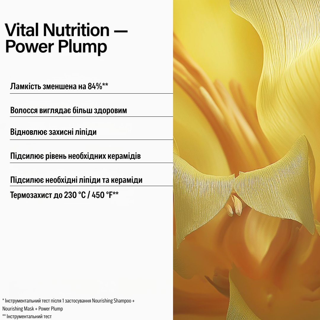 Keune Care Vital Nutrition Power Plump — професійний незмивний гель-крем, створений для глибокого відновлення волосся, яке потребує додаткового живлення та захисту. Продукт заповнює пористі ділянки, згладжує кутикулу і допомагає зберегти вологу, одночасно забезпечуючи термозахист до 230 °C при використанні фену, плойки або праски. Волосся стає більш щільним, м’яким, слухняним і блискучим.