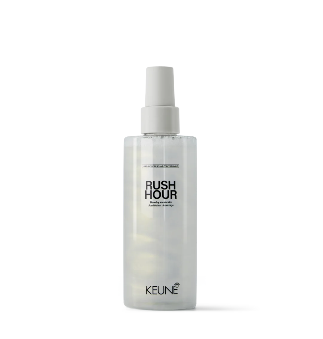Keune Style Rush Hour — професійний спрей для швидшого сушіння волосся феном. Засіб створений для тих, хто цінує час, але не готовий жертвувати якістю укладання та станом волосся. Формула з технологією Bond Fuser підтримує міцність волосся під час сушіння та стайлінгу.
